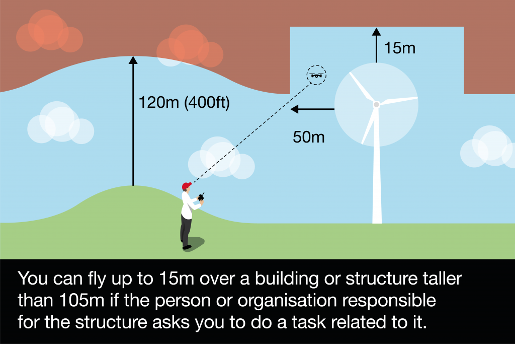 If the person or organisation responsible for a very tall structure over 105m asks you to carry out a task related to their structure, you’re allowed to fly higher than 120m (400ft). For example, if they ask you to take pictures for a survey.